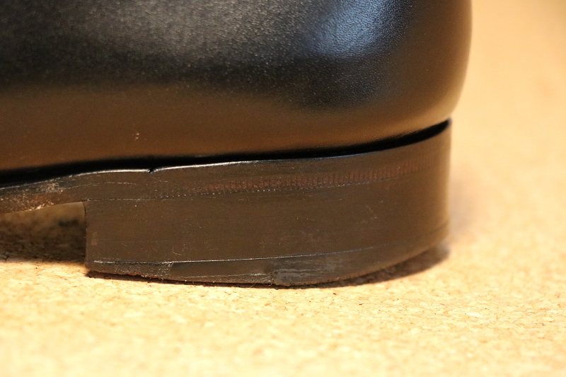 アッパーとヒールとの段差、だし縫いの糸からのコバの出幅に注目していただきたいと思います。