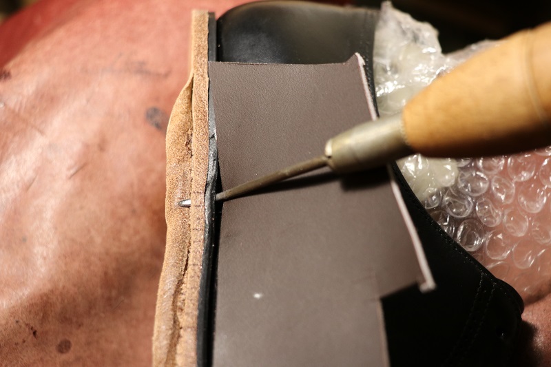 だし縫いが終わったら、今回はつま先にビンテージスチールを貼ります。