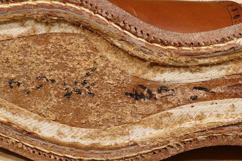 ソールを剥がすと、ときどき出し縫いの糸とすくい縫いの糸が重なっている靴があるのですが、この靴はすくい縫いの外側に出し縫いがしっかり縫われています。